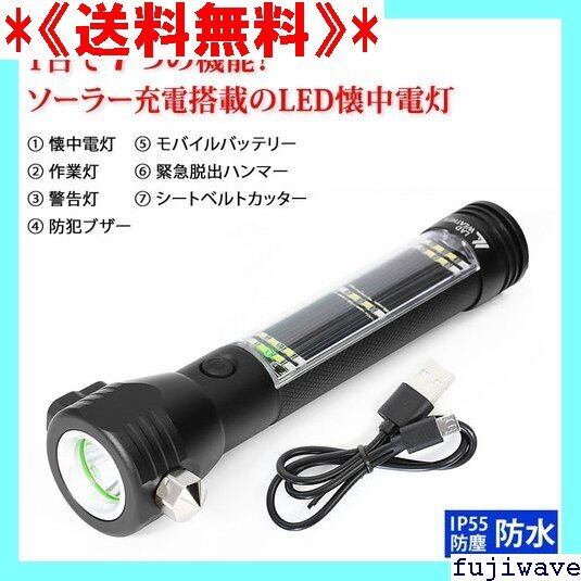 《送料無料》 LEDライト ソーラー搭載 充電式 懐中電灯 1台で7つの機能が満載 IP55 防塵・防水 作業灯 警告灯 防犯ブザー モバイルバッテリー 緊急脱出ハンマー シートベルトカッター LED ライト ワークライト 小型 強力 高輝度 防災 災害 グッズ キャンプ アウトドア 登山 183
